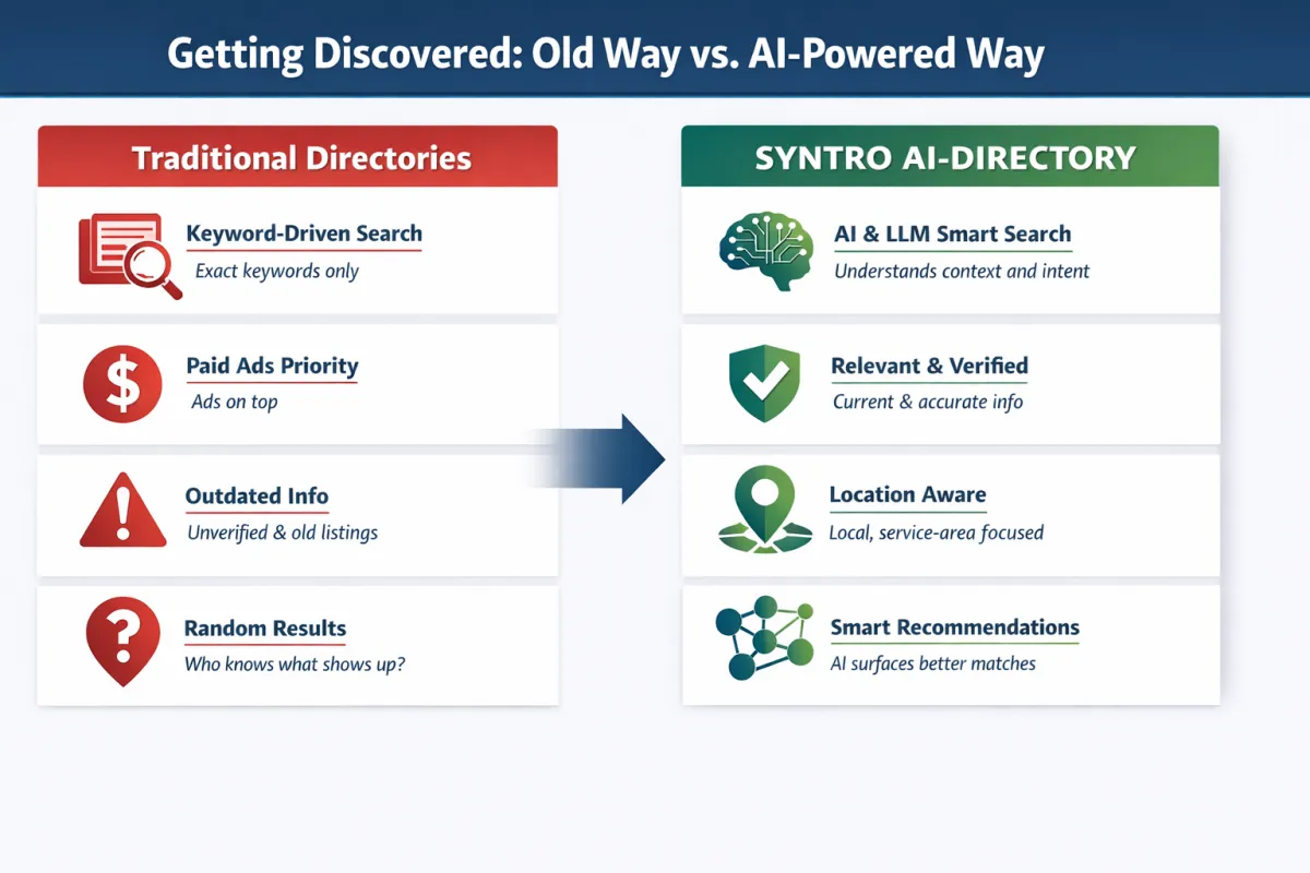 The SYNTRO™ AI Directory is structured to understand intent, not just keywords — ensuring your business appears when customers are ready to act, not just looking around.